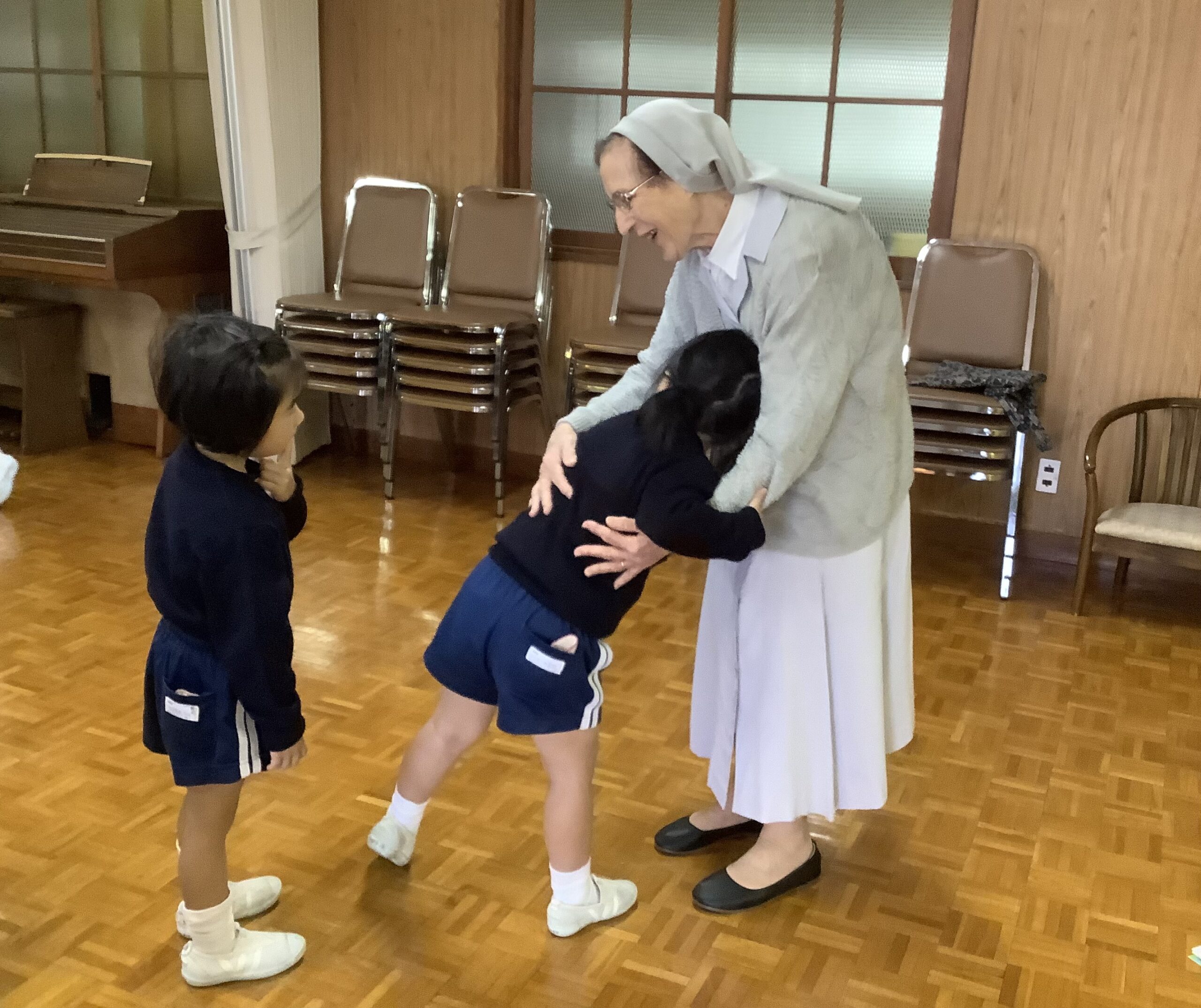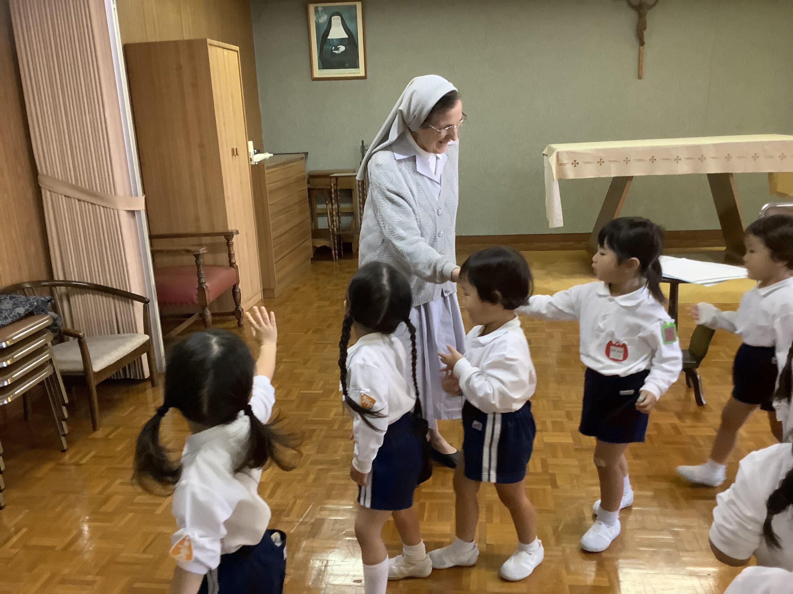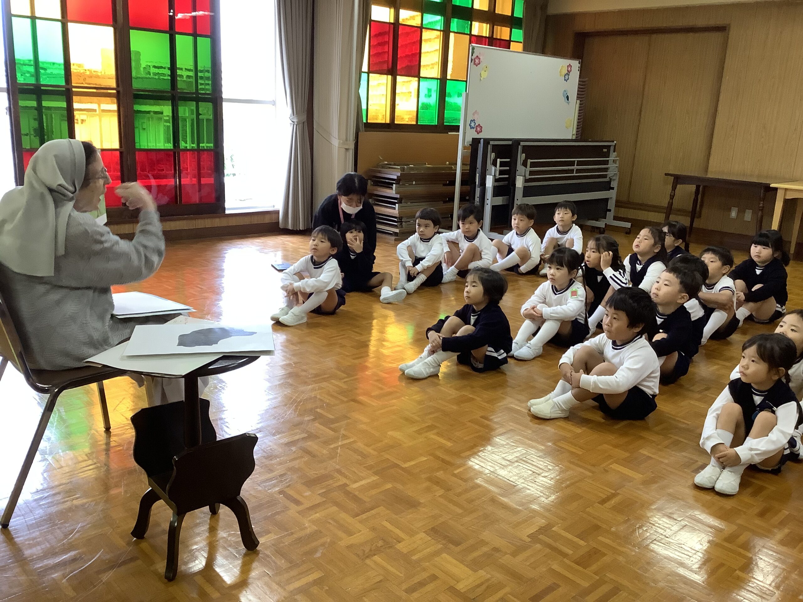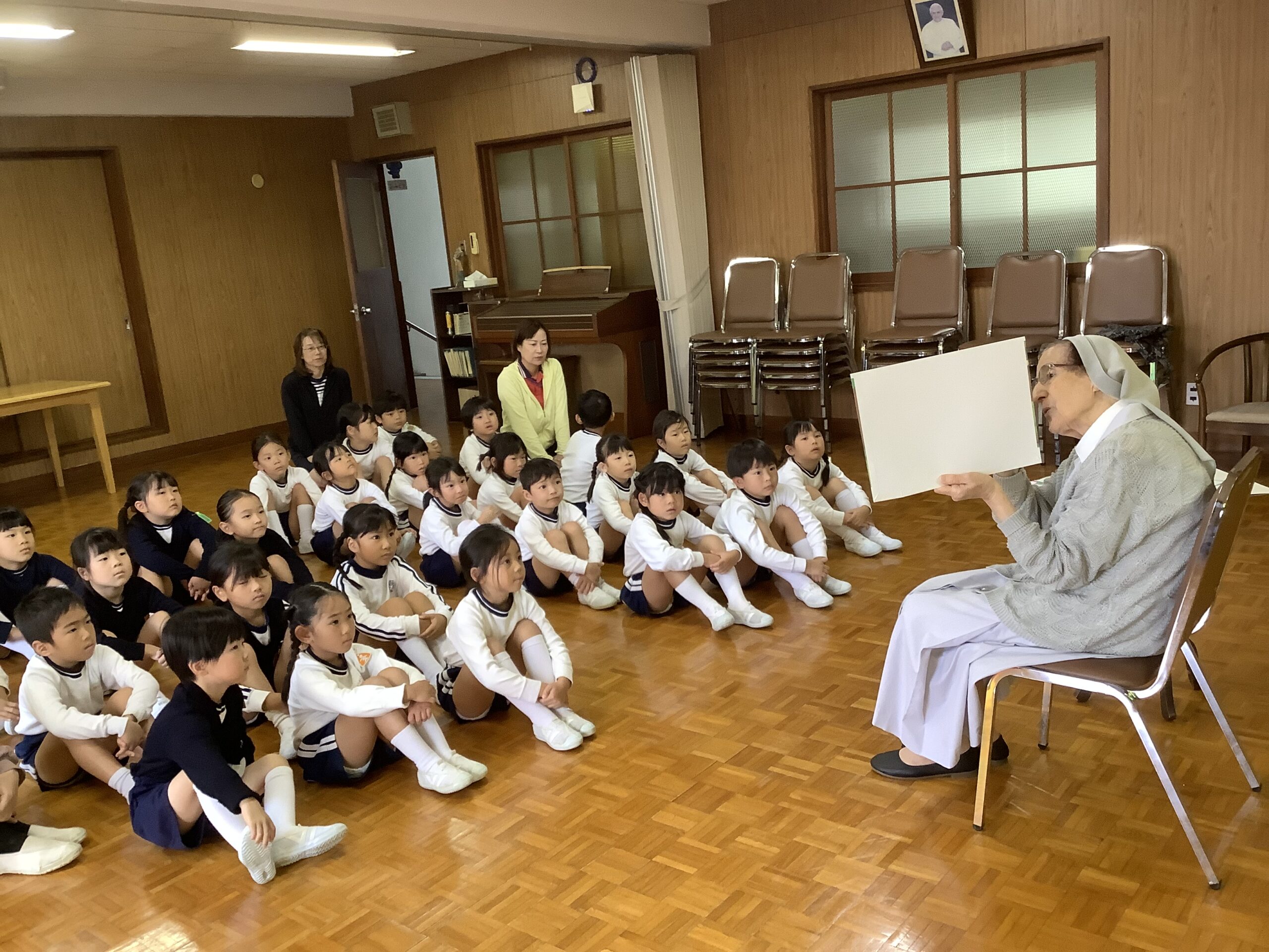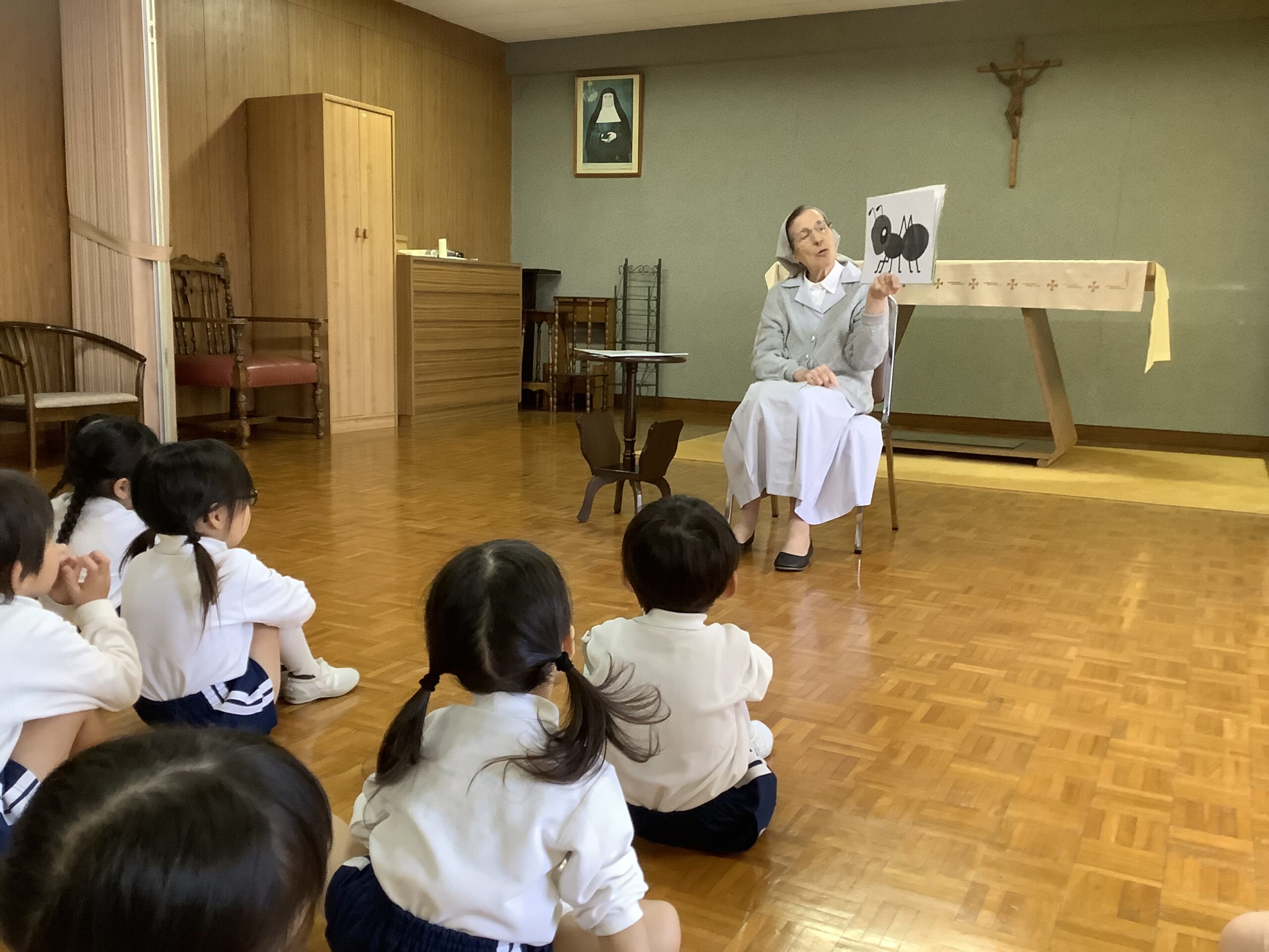 シスターの神さまのお話 2025.10.22 イベント 今日はシスターの「神さまのお話」がありました。 各学年でお御堂に集まりました。 池に落ちたありんこちゃんを助けたハトさん。銃で狙われたハトさんを救うありんこちゃん。 困った時に助けてもらったら「ありがとう」と感謝を伝えることが大切だと学びました。 お友だちだけでなくお家の方や周りの方にも日頃の感謝を伝えられるようになりたいですね。
