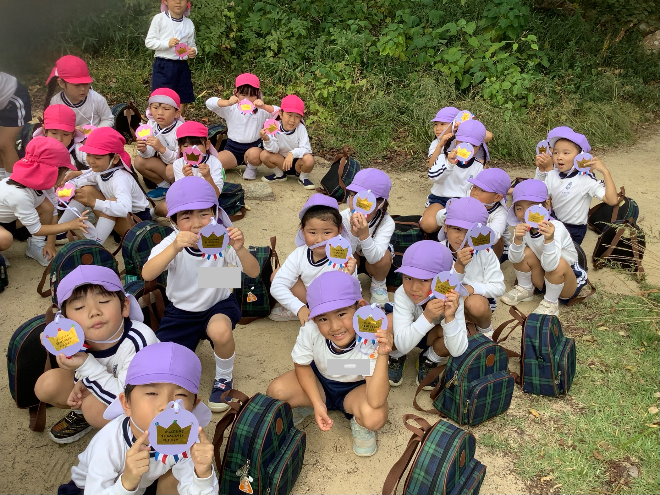 登っている途中にきれいな海が見え「ヤッホー!!」と最高の眺めを楽しみました。頂上では、メダルのご褒美!よく頑張りましたね。