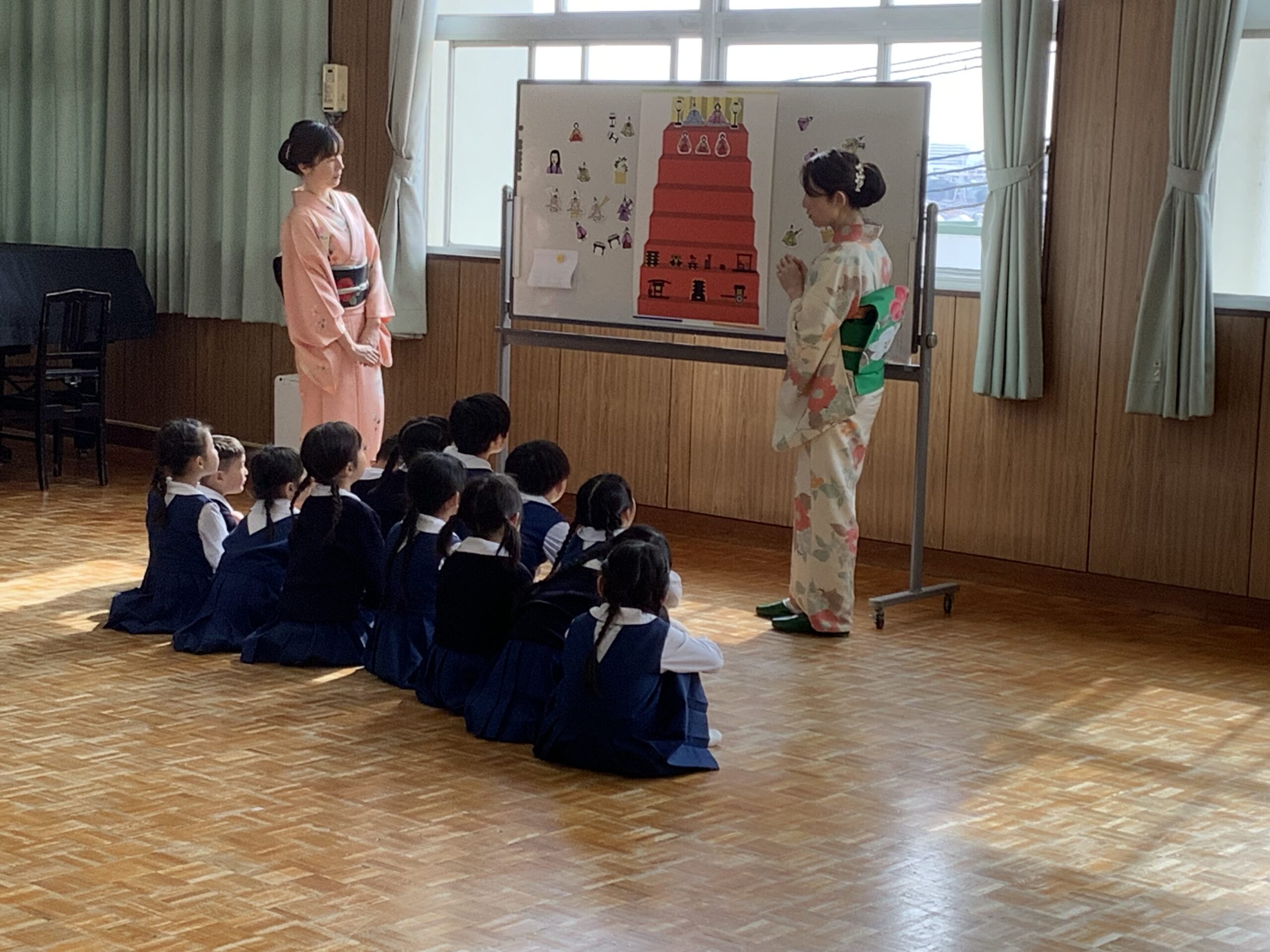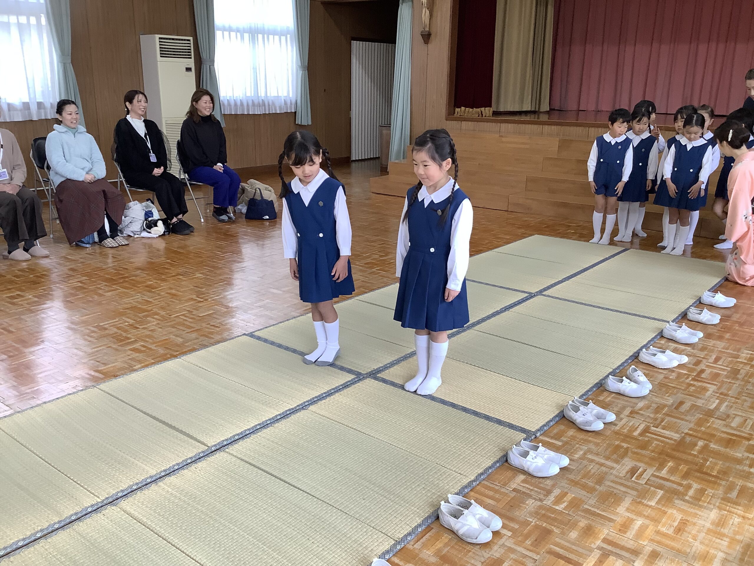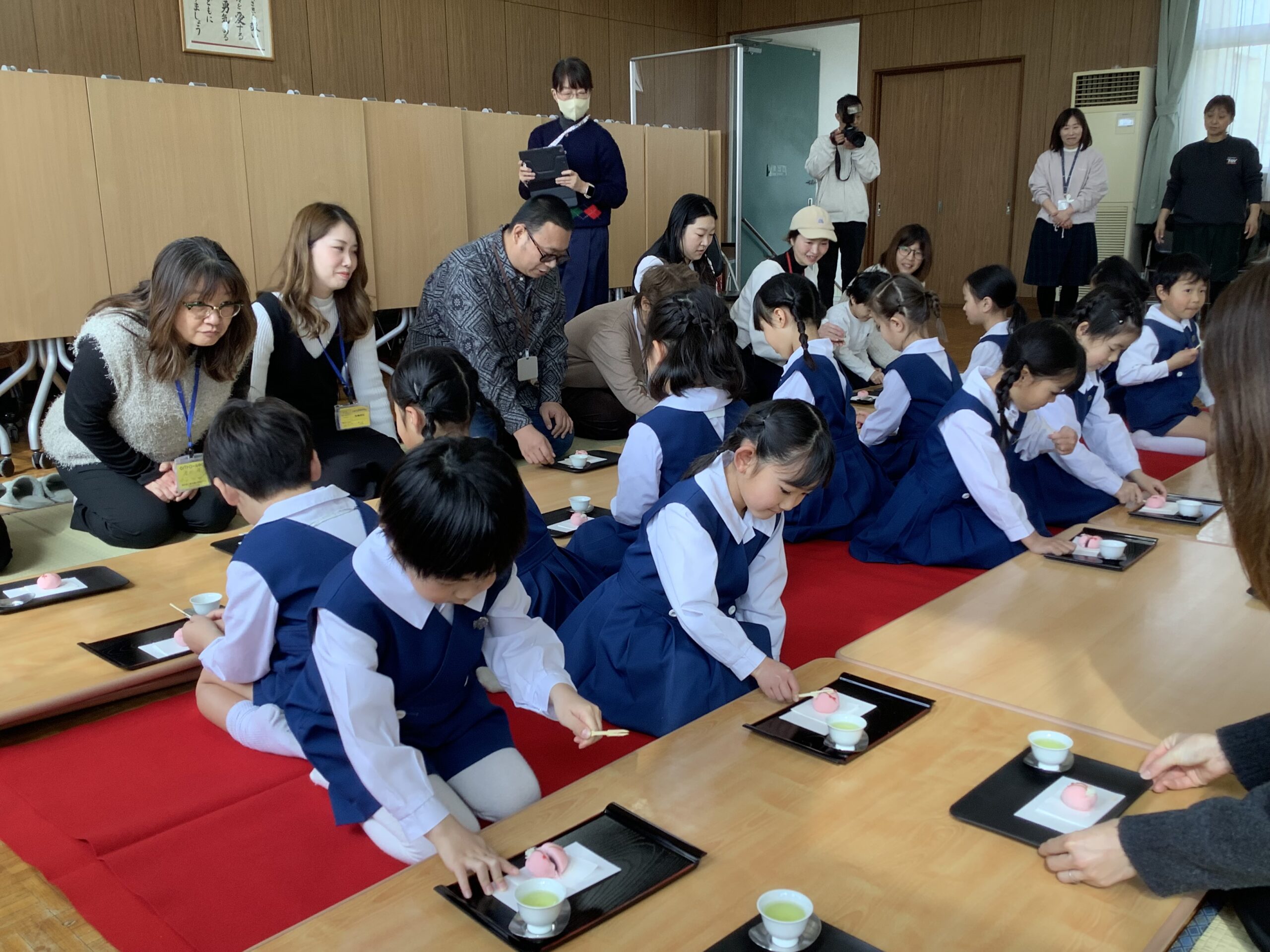 年長組 茶道教室参観 2026.02.24 イベント 先日、茶道教室の参観がありました。 今まで教えていただいたお作法を思い出しながら取り組みました。 ひなまつりの由来のお話では、ひな人形の名前や配置など分かりやすく教えていただきました。 そして、お茶と和菓子でおもてなし。 こぼさないようにドキドキしながら、お家の方のところまでそ〜っと上手に運べましたね。 一緒にいただくお茶と和菓子は特別甘くて美味しかったですね。 茶道教室を通して、礼儀作法を身につけ、相手を思いやる「おもてなし」の心や、感謝の気持ちを育むことができました。